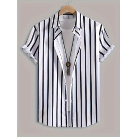 Color Block Stripe Pattern Print Men's Short Sleeve Button Up Lapel Shirt For Summer Resort Holiday, Hawaiian Style