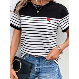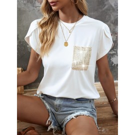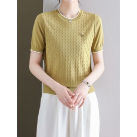 Solid Crew Neck T-shirt, Elegant Short Sleeve Ruched Top For Spring & Summer, Women's Clothing