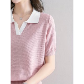 Solid Polo Neck T-Shirt, Casual Contrast Trim Short Sleeve T-Shirt For Spring & Summer, Women's Clothing