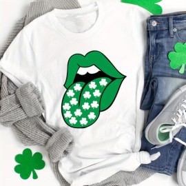 St. Patrick's Day Clover & Lips Print T-shirt, Casual Short Sleeve Crew Neck Top For Spring & Summer, Women's Clothing