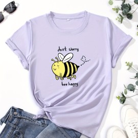Cartoon Bee Print Crew Neck T-Shirt, Casual Short Sleeve T-Shirt For Spring & Summer, Women's Clothing