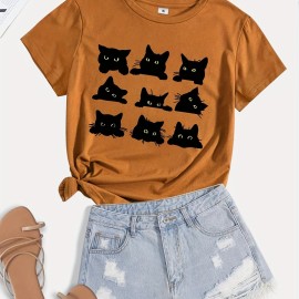 Cartoon Cats Print T-Shirt, Short Sleeve Crew Neck Casual Top For Summer & Spring, Women's Clothing